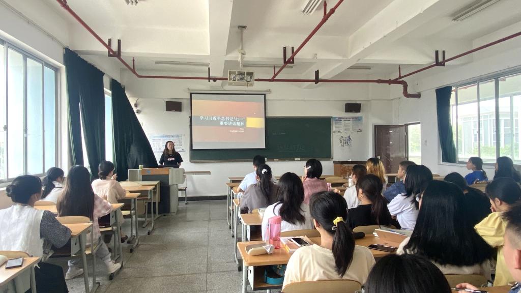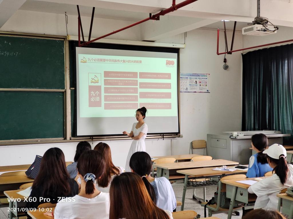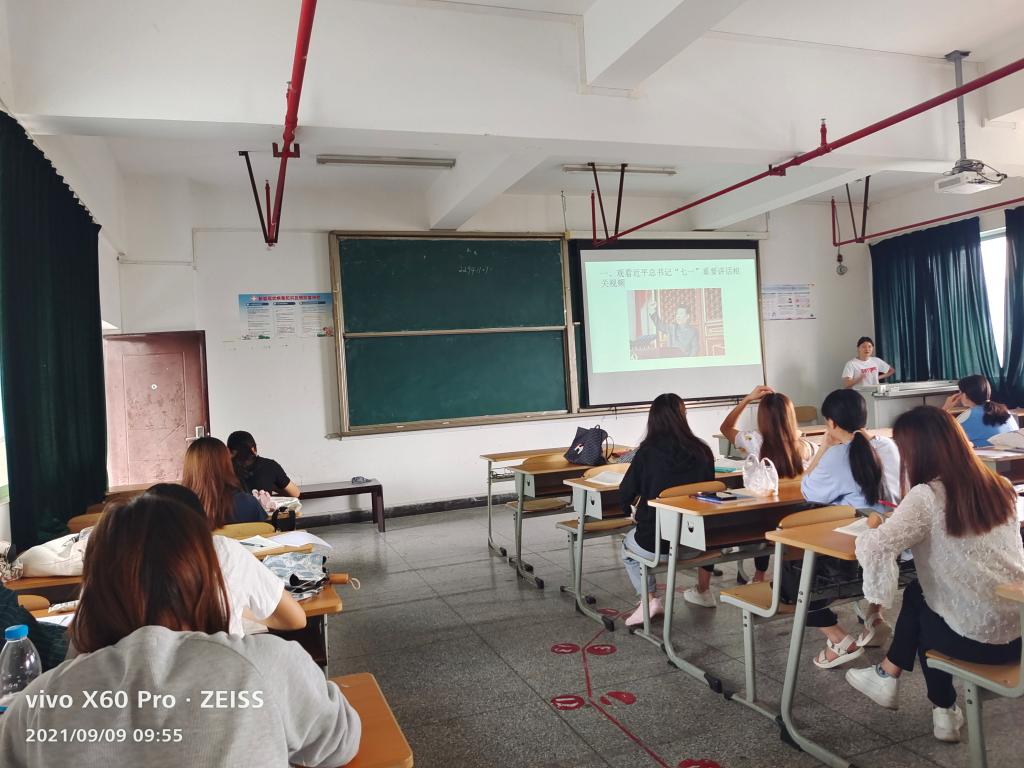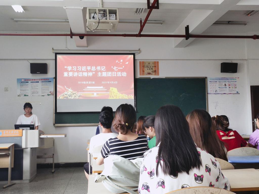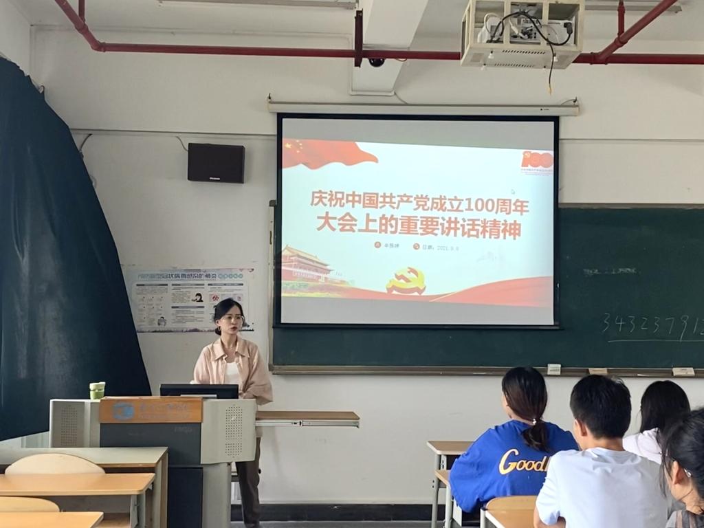其次,学院团委负责人辛雅婷老师深入2018级日语班、商务英语班、2020级英语2班团支部参与主题团日活动,在聆听完团支书或其他团干部宣讲后,同学们踊跃发言并交流学习心得,辛雅婷老师分别点评了同学们的发言并再次和大家一同观看了七一讲话视频,最后,在所在团支部进行了习近平总书记七一讲话内容的主题宣讲。着重从“五个庄严宣告”、“四个伟大成就” “伟大建党精神” ”九个必须 ”出发,为大家全面解读这次会议精神。同学们不禁感慨自己何其有幸生于华夏,生于盛世,见证百年。我们长在红旗下,生在春风里,不经战乱,不缺衣食。人民有信仰,国家有力量,民族有希望。目光所致皆为华夏,五星闪耀皆为信仰。