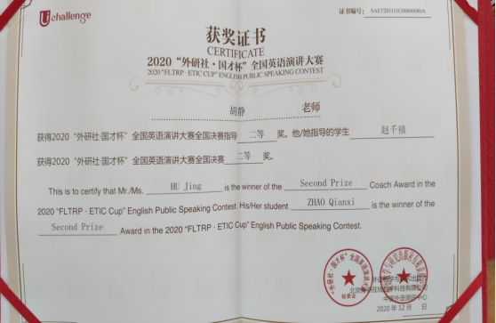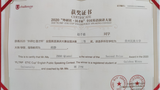 胡静老师指导的文学院2017级戏剧影视文学专业的赵千禧同学在第一阶段演讲中以“Challenge to All, Challenge to Humanity”为题,稳定发挥,以小组赛第二的成绩(89.75分)突围进入15日第二阶段(线上)比赛,成为本次演讲大赛贵州省唯一进入88强的选手,最终荣获全国英语演讲大赛二等奖,再创历史最好成绩!