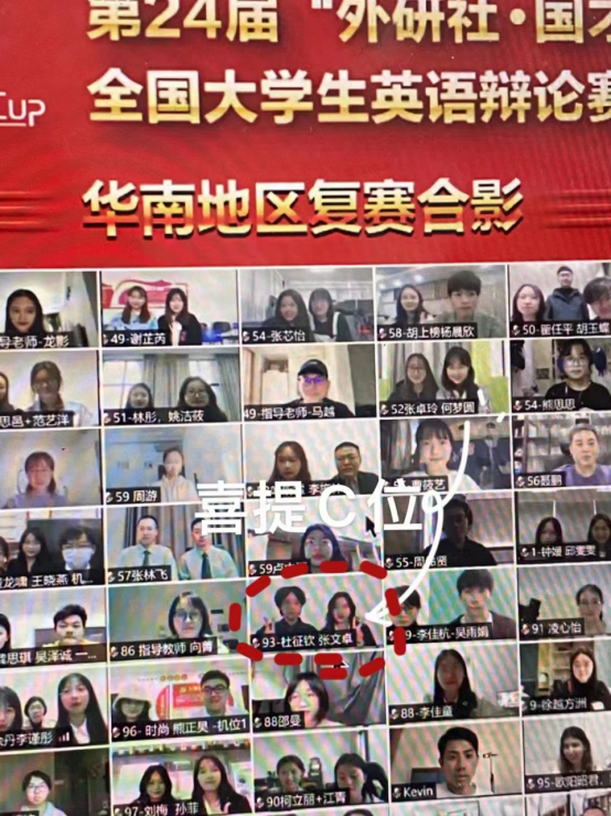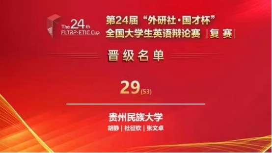 老司机 2020级英语专业杜征钦同学和法学院2020级法学专业的张文卓同学,在老司机 胡静老师的悉心指导下,在华南地区复赛中,经过4月16日和17日两天五轮的激烈比拼,荣获三等奖,成功晋级第24届“外研社·国才杯”全国大学生英语辩论赛全国总决赛,使老司机 成为贵州省唯一获得晋级全国总决赛的高校。
