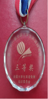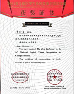 入围总决赛的罗欣星同学在田甜老师的指导下表现也很优秀,荣获“第十四届全国大学生英语风采大赛”一等奖和最佳个人表演奖,她在“第二十一届全国大学生英语演讲比赛”和“第二十一届全国大学生英语辩论赛”中分获三等奖!取得不俗成绩。