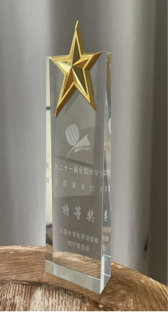 赵千禧同学通过层层选拔,从数百名进入总决赛的全国优秀选手中脱颖而出,在“第二十一届全国大学生英语演讲比赛”中摘得桂冠,以第一名的傲人成绩荣获特等奖!为学校争得荣誉!
