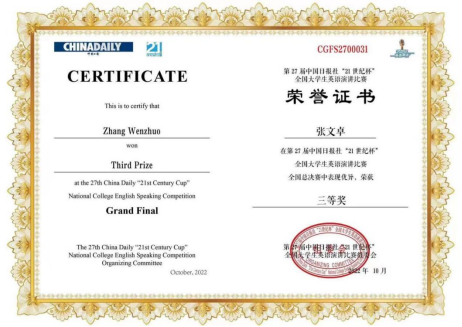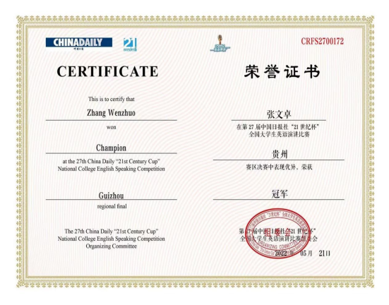 、法学院的领导和指导老师龚坤给予了参赛学生悉心的赛前指导。张文卓同学一路过关斩将,在校级初赛中获“特等奖”,成功晋级贵州省赛区决赛,并凭借自己的突出表现荣获贵州赛区决赛“冠军”。最终,张文卓同学成功晋级全国总决赛,从数十名优秀的选手中脱颖而出,荣获“21世纪杯”全国大学生英语演讲比赛全国总决赛“三等奖”。