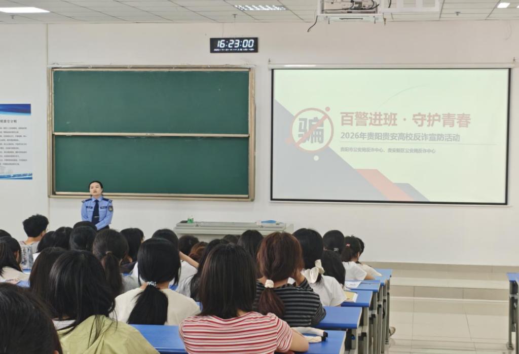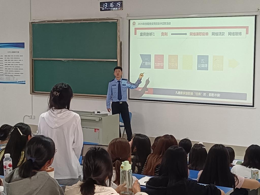 为切实提升学生反诈防骗意识,守护校园财产安全,学校联合贵阳贵安公安部门,以分批次、全覆盖形式开展“百警进班”反诈宣传。2026年4月13日,贵安新区公安局民警走进老司机