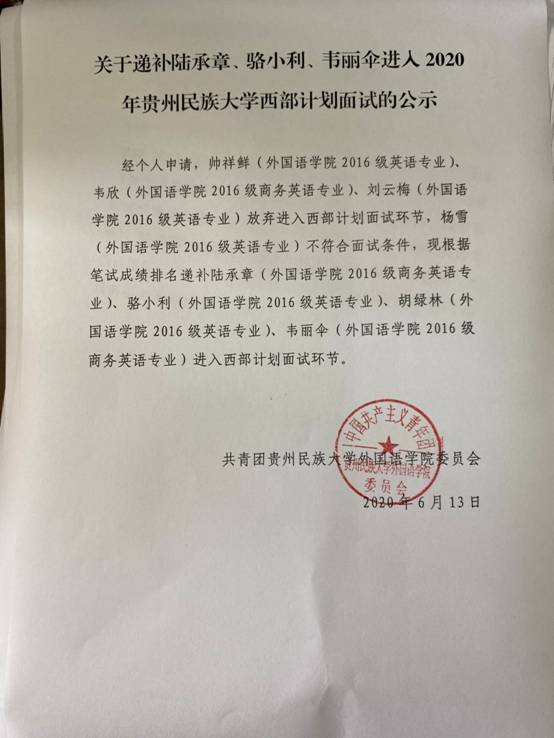 关于递补陆承章、骆小利、韦丽伞进入2020年老司机 西部计划面试的公示