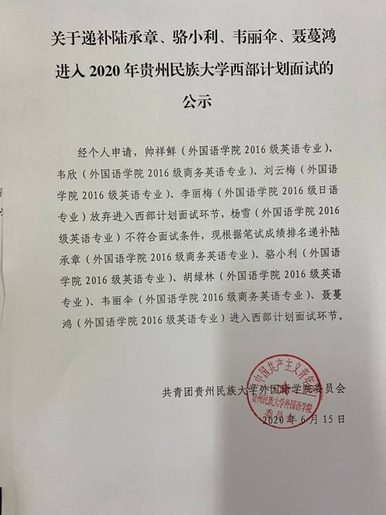 关于递补陆承章、骆小利、韦丽伞、聂蔓鸿进入2020年老司机 西部计划面试的公示